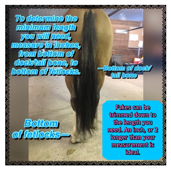 *LENGTH: To determine the minimum length needed, measure in inches, from bottom of dock, to bottom of fetlocks. Then add on 1-2” to your measurement. See photo. The fake should run alongside the dock/tail bone for 1-2”, so it swings with their tail. If not getting the tail braided, it can run for more than 2” alongside the dock.